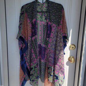 Beautiful and colorful flowy kimono! Some burnout velvet details throughout the designs. Would look pretty with a simple white, blue, or purple top and shorts, wife leg denim, or even white pants!