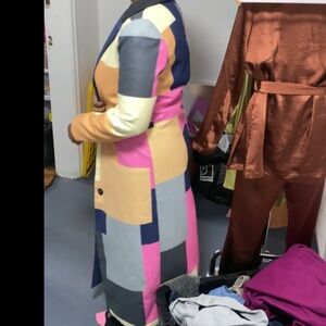 Stand out with this vibrant patchwork long coat. Featuring a mix of pink, blue, yellow, and gray, this coat adds a pop of color to any outfit. Perfect for making a bold fashion statement.