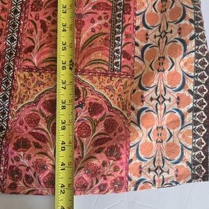 Vibrant maxi dress with a patchwork design. Features shades of pink, red, and orange.