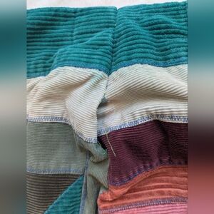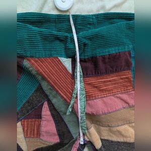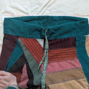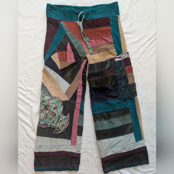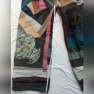 Vibrant patchwork pants with a unique design. Features a mix of colors including teal, burgundy, and tan.