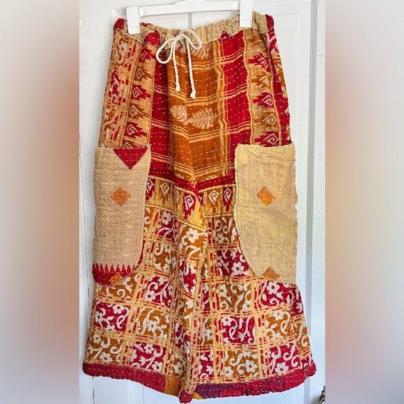 Vibrant patchwork pants with red, orange, and cream floral patterns. Unique and stylish design. Breathable fabric, perfect for the summer months. Extra large pockets. Brand new, never worn