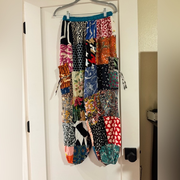 Vibrant patchwork pants with a mix of patterns and colors. Perfect for a bold fashion statement.