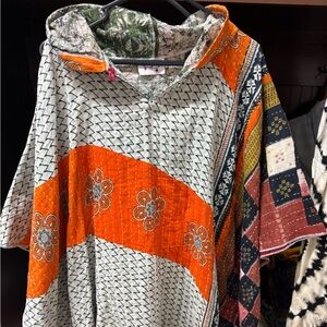 Vibrant poncho with a mix of patterns. Features orange, black, and white colors. Perfect for a bold look.