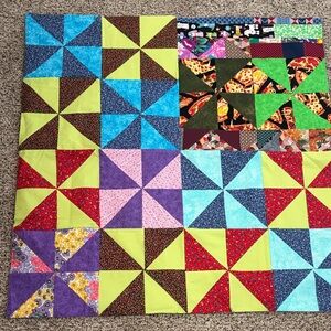 Vibrant patchwork lap quilt with geometric patterns. Features a mix of bright colors including green, blue, purple, and red. Cut over a rocker or even on a small table.