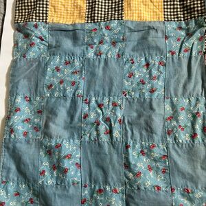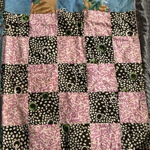 Vibrant patchwork quilt with floral and checkered patterns. Features blue, yellow, pink, and black colors.