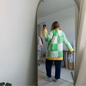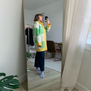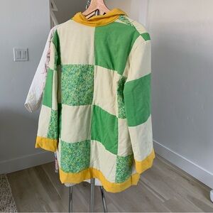 Vibrant patchwork jacket with green, yellow, and cream squares. Perfect for a bold statement.