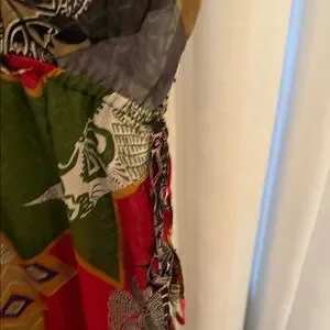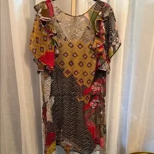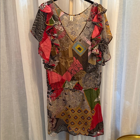 Step out in style with this colorful patchwork mini dress. Featuring vibrant ruffles, it's a perfect choice for any occasion. Perfect for cover up for beach. 100% silk. Seeing through.