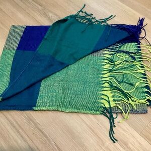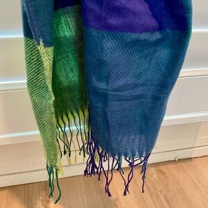 Vibrant fringed scarf with a patchwork design. Very soft. Features blue, green, and yellow sections. Perfect for adding a pop of color. NWOT.
