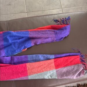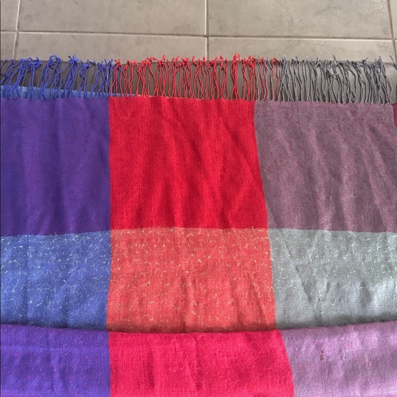 Vibrant scarf with red, purple, and gray patches. Perfect for adding a pop of color.