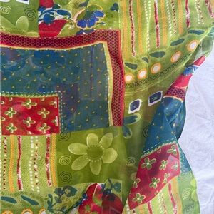 Add a vibrant touch to your outfit with this colorful patchwork scarf. Featuring a mix of green, red, and blue hues, it's perfect for any occasion.