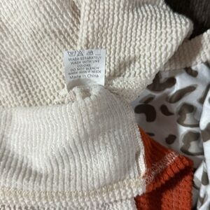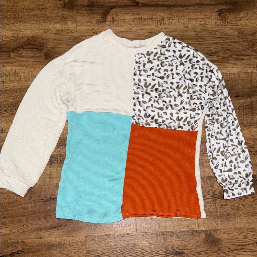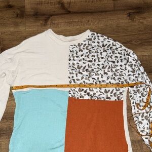 This vibrant shirt features a playful patchwork design with cream, blue, orange, and brown patterns. Perfect for adding a splash of color to any outfit.