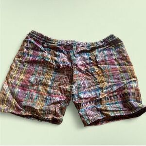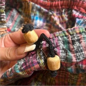 multicolored patchwork, wooden bead accents, distressed detailing, bohemian style, tribal influence, eclectic fashion, festival wear, handmade shorts, artistic design, vibrant pattern