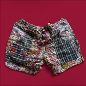 Latin Multi-coloured custom made patchwork shorts with wooden beads and zipper