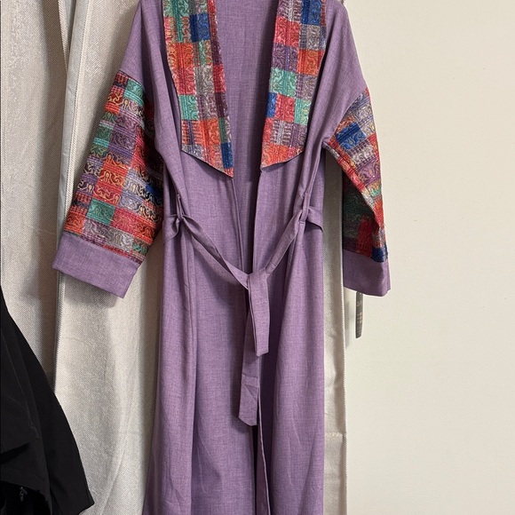 Vibrant robe with colorful patchwork sleeves. Features a tie belt and open front. Perfect for adding a pop of color to your wardrobe.