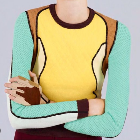 Vibrant sweater with yellow, brown, and mint green patches. Unique design with contrasting colors.