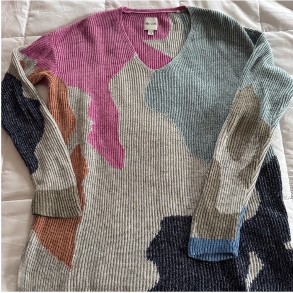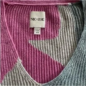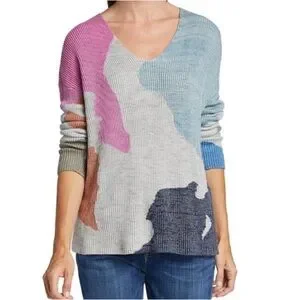 This NIC+ZOE sweater features a stylish v-neck design with a blend of pink and blue hues. The abstract camo-like pattern adds a modern touch, while the ribbed knit texture ensures comfort and warmth. Perfect for adding a contemporary flair to your wardrobe.