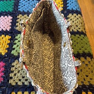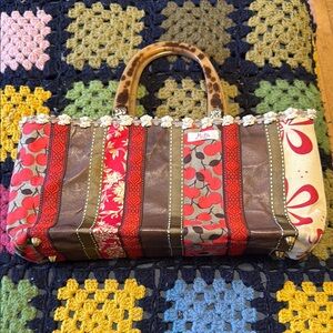 This vibrant tote bag features a unique patchwork design with red, brown, and tan hues. Perfect for adding a pop of color to any outfit.