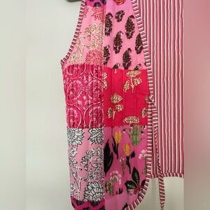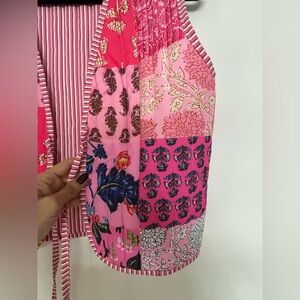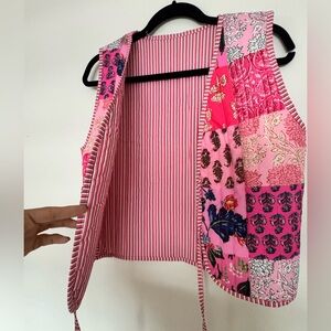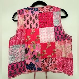 Vibrant patchwork vest with floral and striped patterns. Features shades of pink and blue. Use with a tee or solo!