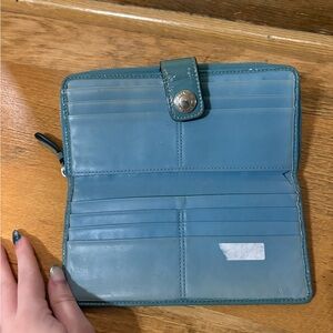 Stylish wallet with colorful patchwork design. Features a snap closure and multiple compartments.