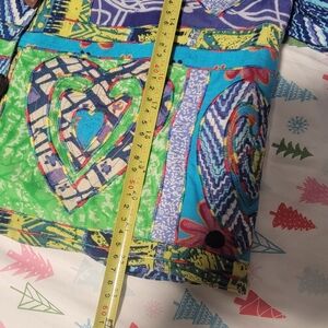 Vibrant and stylish, this colorful patchwork jacket is perfect for making a statement. Featuring a mix of blue, green, and purple hues, it's a unique addition to any wardrobe.