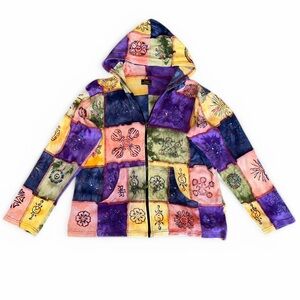zip up hoodie, patchwork multicolored cloth & patterns, fits like a M/L