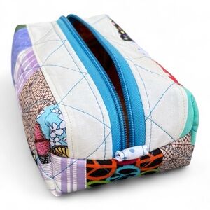 Vibrant patchwork pouch with a blue zipper. Features a mix of colors including red, blue, and white.