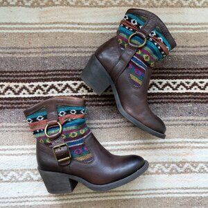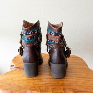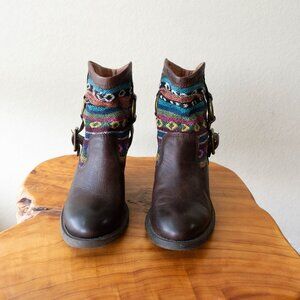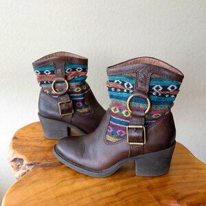 Step out in style with these vibrant ankle boots. Featuring a colorful patterned design, these boots are perfect for adding a pop of color to any outfit. The rich brown leather complements the multicolored fabric, making them a versatile choice for any wardrobe.
