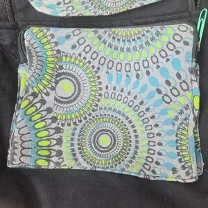 Stylish backpack with a vibrant circular pattern. Features multiple zippered pockets for convenience.