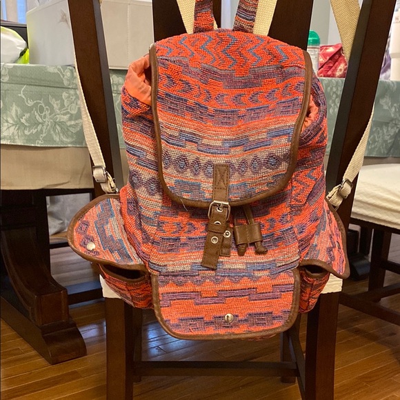 Vibrant cloth backpack with a colorful pattern. Features a mix of pink, blue, and brown hues. Stylish and functional for everyday use. Buckle clasp and two pockets on the side for pocket umbrellas or small water bottle.