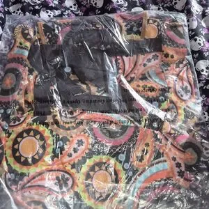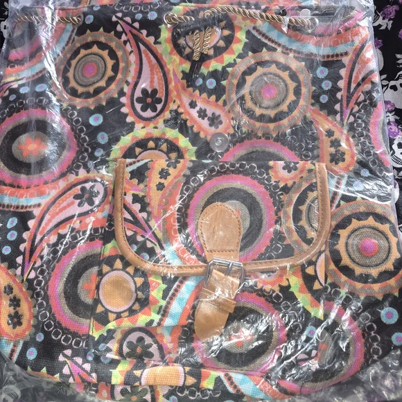 Vibrant backpack with a colorful pattern. Features a buckle closure and front pocket.