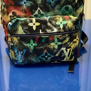 Vibrant backpack with a multicolor pattern. Features a front zipper pocket.