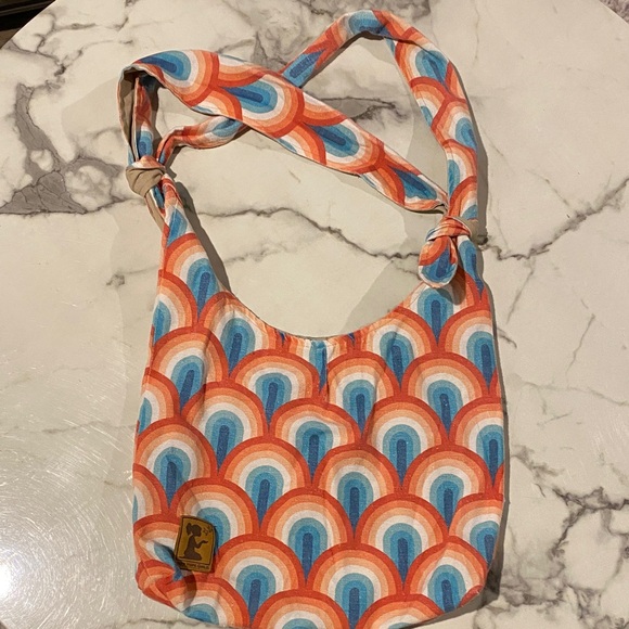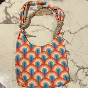 This handmade bag features a colorful pattern with shades of orange, blue, and cream forming arches. As far as I can tell, the exterior is a cotton weave and the interior lining is a tan cotton. I have washed this bag a couple of times, so the color has a bit of fade. Spacious interior with two small side pockets and a snap to held keep the inside shut. The straps/handle can be tied and adjusted in different ways for various styles and length of bag. Some of the fabric is fraying at the bottom, but it is cosmetic only, with the lining intact. Originally purchased from New Hope Girls, a nonprofit organization. It was my go-to bag to take to the farmer’s market.