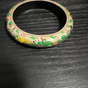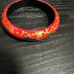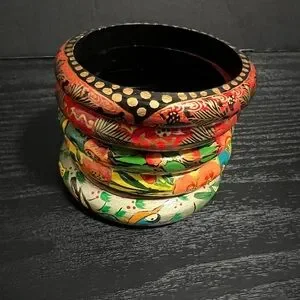 Set of vibrant bangles with intricate patterns. Features red, orange, and green designs. These bangles are from a smoke-free home.