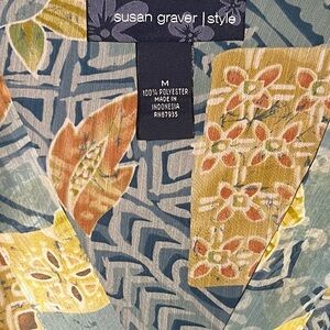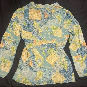 Chic blouse with floral and geometric patterns. Features blue, green, and orange hues. Ideal for a fashionable ensemble.
