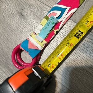 Vibrant belt with a colorful pattern. Features shades of pink, blue, and green.