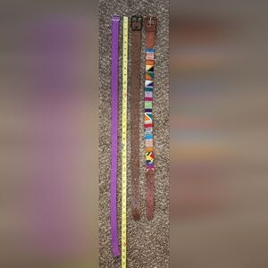 Set of three belts: purple, brown with embossed design, and multicolored pattern. Perfect for adding style to any outfit.