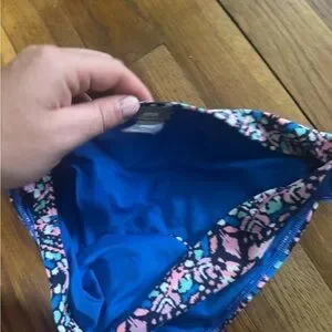 Vibrant bikini bottom with a colorful pattern. Features shades of blue, pink, and black.