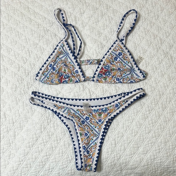 Vibrant bikini set with intricate patterns. Features a mix of blue, white, and multicolor designs. Perfect for a stylish beach day.