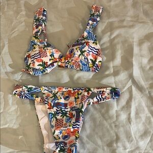 Vibrant bikini set with a colorful pattern. Features a mix of blue, orange, and green designs.