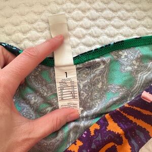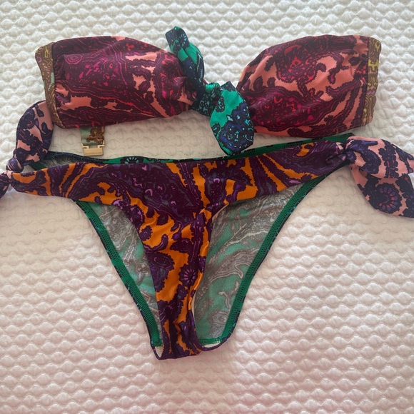 Vibrant bikini set with a mix of colors and patterns. Bandeau top (removable straps included) and matching bottoms. Zimmermann size 1- equivalent to a Small