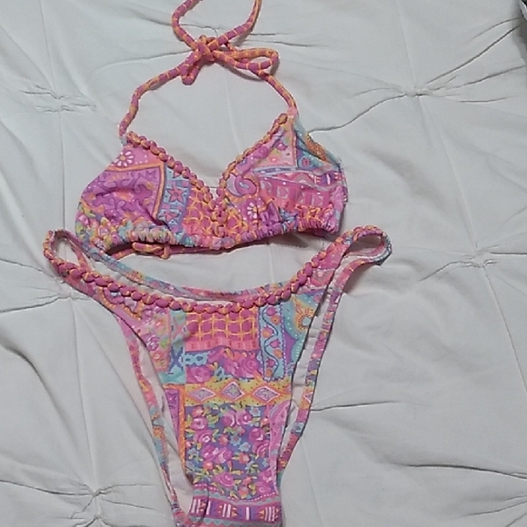 Vibrant bikini set with a colorful pattern. Features a halter top and matching bottoms.