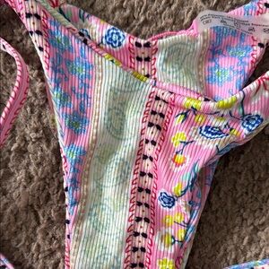 Vibrant bikini set with a colorful pattern. Features pink, blue, and yellow hues.