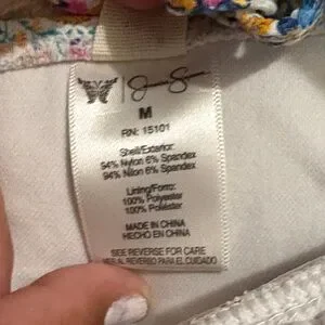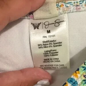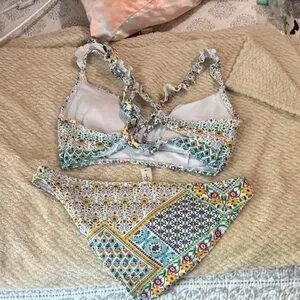 Vibrant bikini set with intricate patterns. Features a mix of blue, yellow, and green colors.