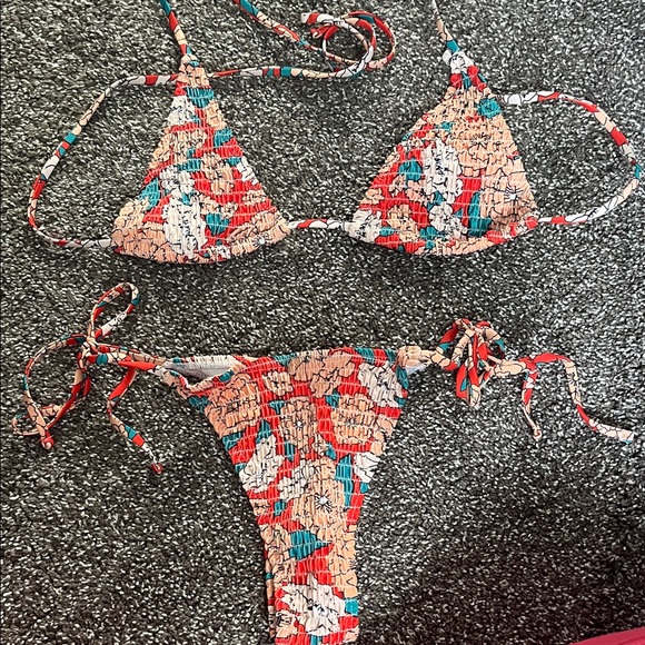 Vibrant bikini set with a colorful pattern. Features adjustable ties for a perfect fit.