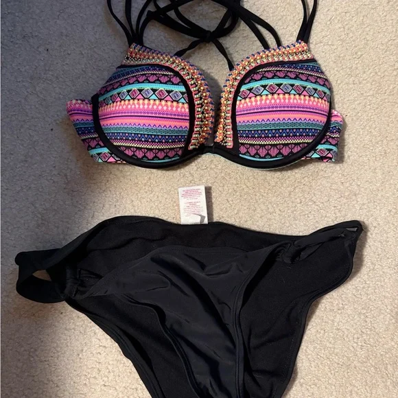 Vibrant bikini set featuring a colorful patterned top and solid black bottoms. Perfect for a stylish day at the beach. Top is 36B and bottoms are large.