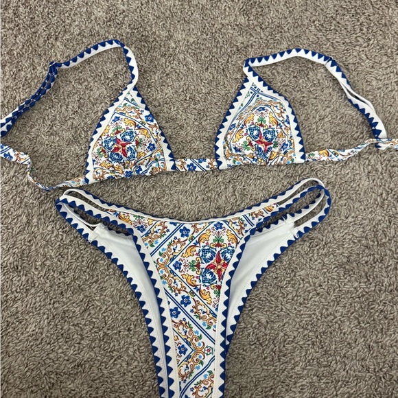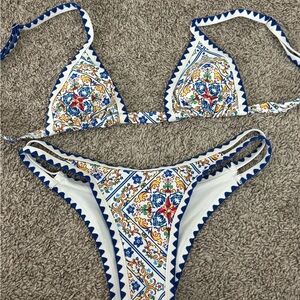 Vibrant bikini set with intricate patterns. Features blue and white with multicolor accents.