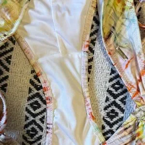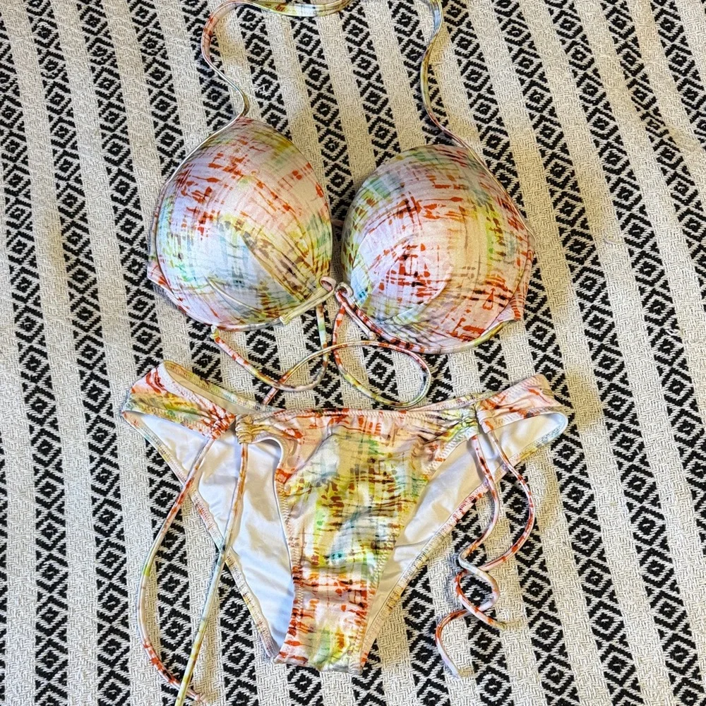 Vibrant bikini set with a colorful pattern. Features adjustable straps for a perfect fit.