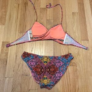 Vibrant bikini set with intricate patterns. Features a mix of colors including blue, red, and pink.