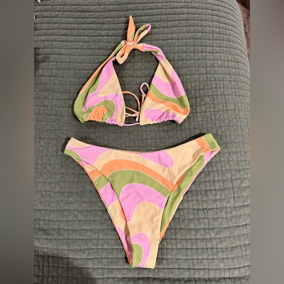 Vibrant bikini set featuring a playful mix of pink, orange, and green. Perfect for a stylish day at the beach.