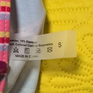 Vibrant bikini set with a colorful pattern. Features pink, blue, and green hues.